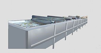 化冰機采用氣泡與熱水協作,有效地使物料充分解凍,物料落入水中,利用槽體中翻騰的水將物料攪動,把冷氣帶出擴散到空氣當中。